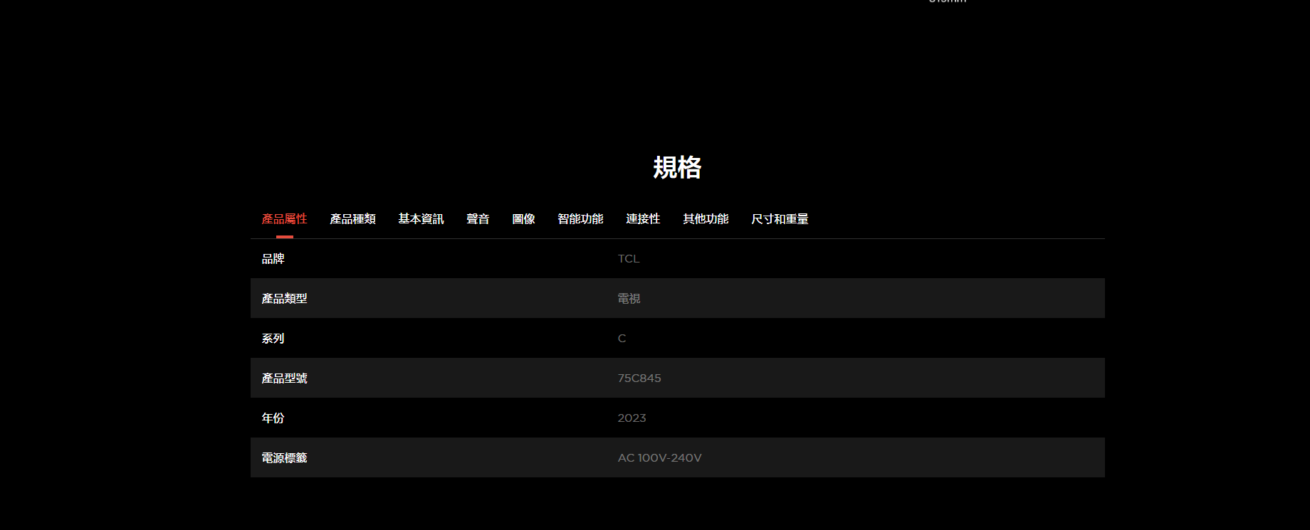 • 产品属性: 品牌 TCL 產品類型 電視 系列 C 產品型號 75C845 年份 2023 電源標籤 AC 100V-240V
